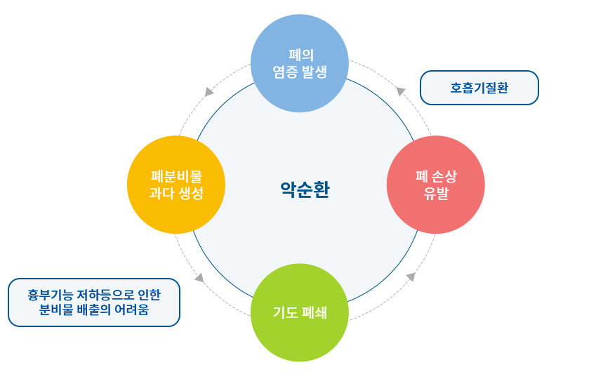 방어능력을 감소시켜, 또다시 폐 분비물의 축적을 유도하고 기도 장애를 일으키는 악순환의 구조를 생성하게 됩니다.